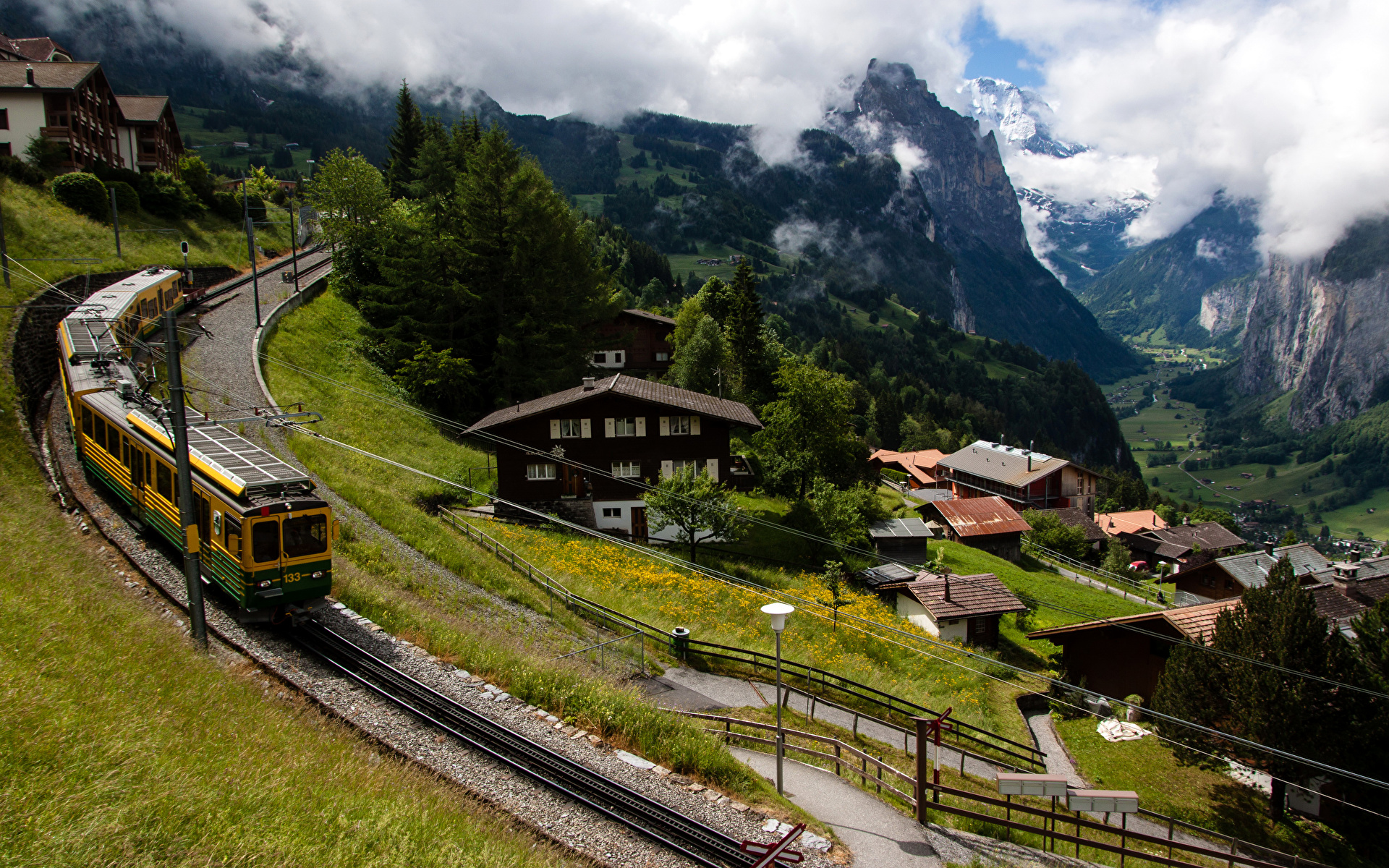 Швейцария Пейзаж Дома Горы Поезда Железные дороги Lauterbrunnen Города фото 1920x1200