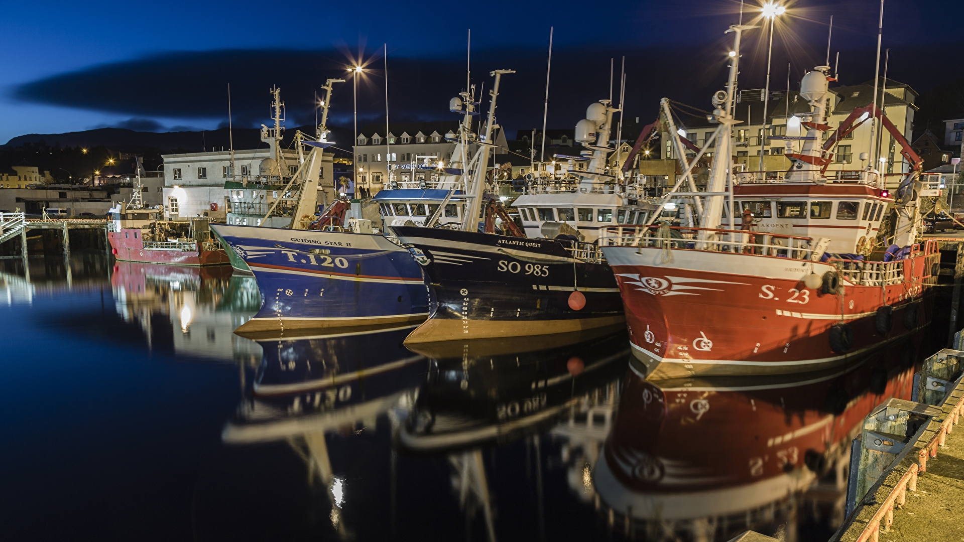 Ирландия Причалы Корабли Killybegs harbour Ночь Уличные фонари Города фото 1920x1080