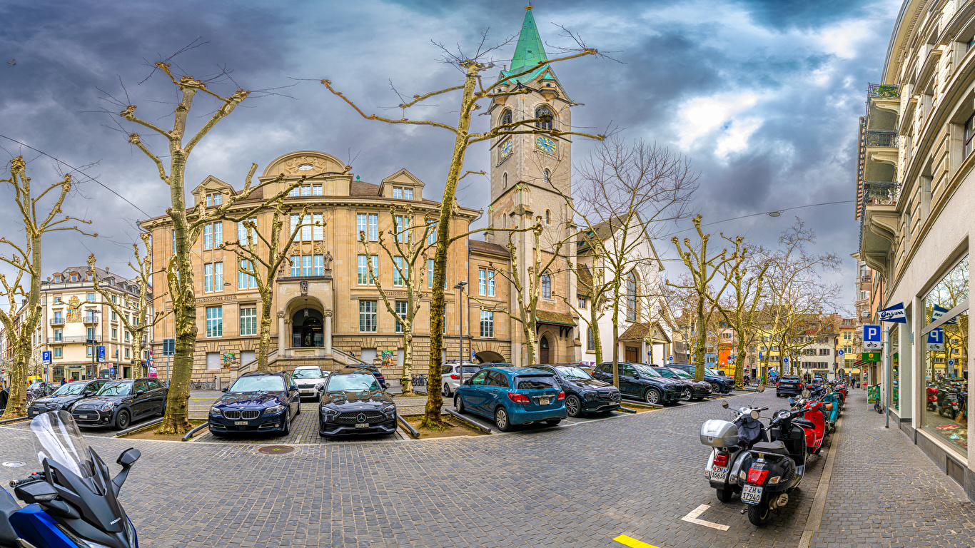Швейцария Цюрих Дома Улица Города Автомобили Мотоциклы фото 1366x768
