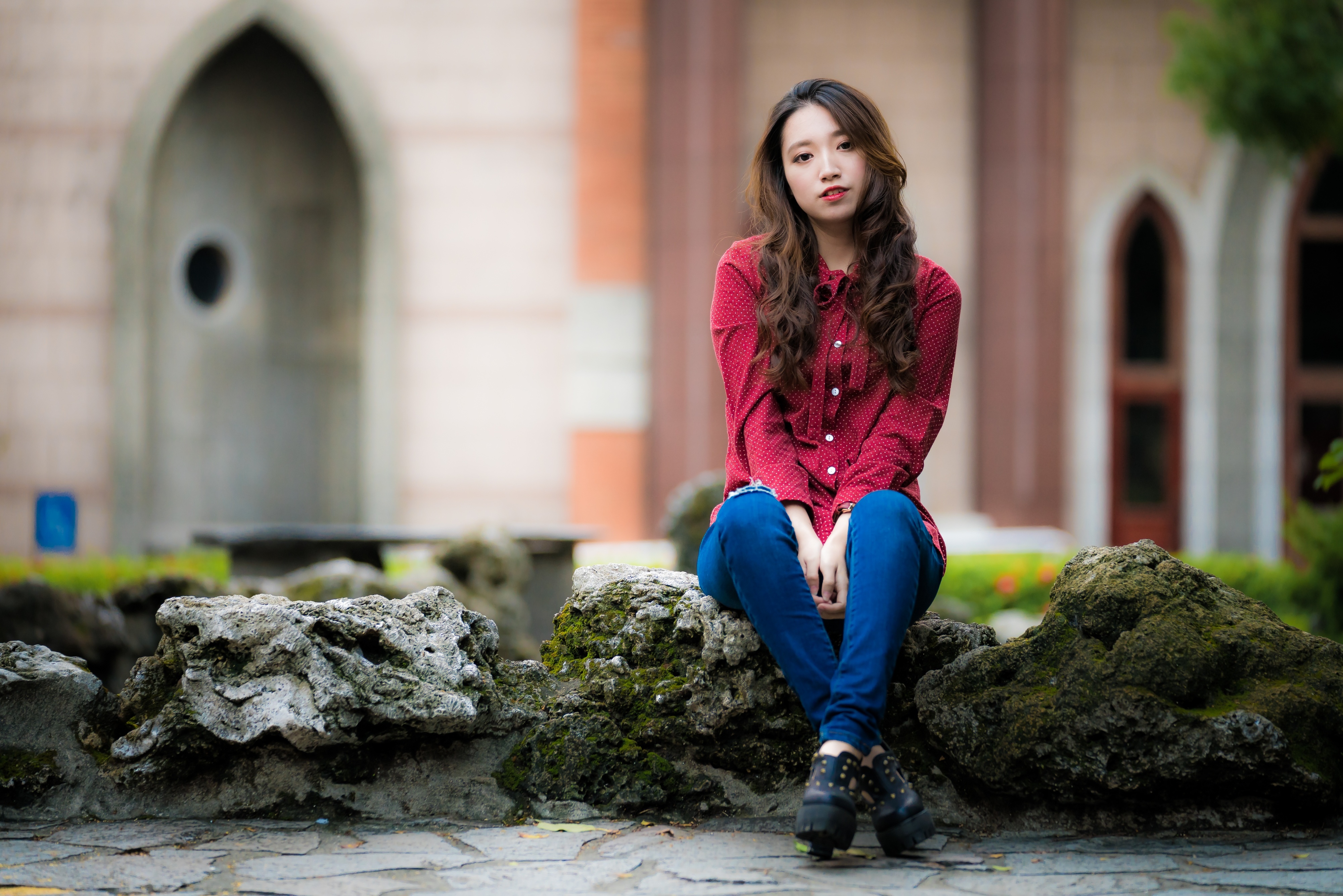 Азиаты Камни Размытый фон Сидит Девушки фото 4000x2668