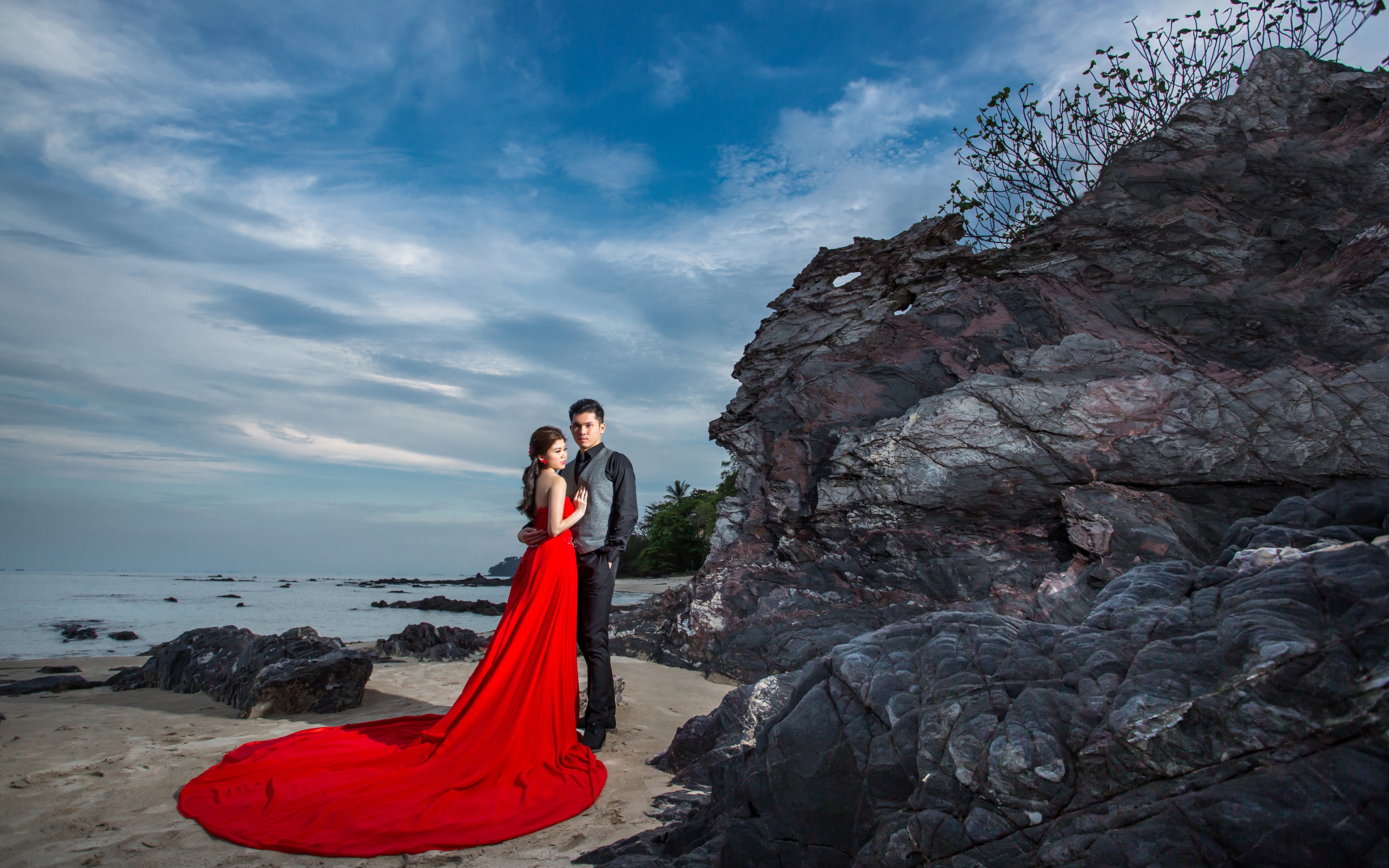Азиаты Мужчины Скала Двое Объятие Платье Девушки фото 3840x2400