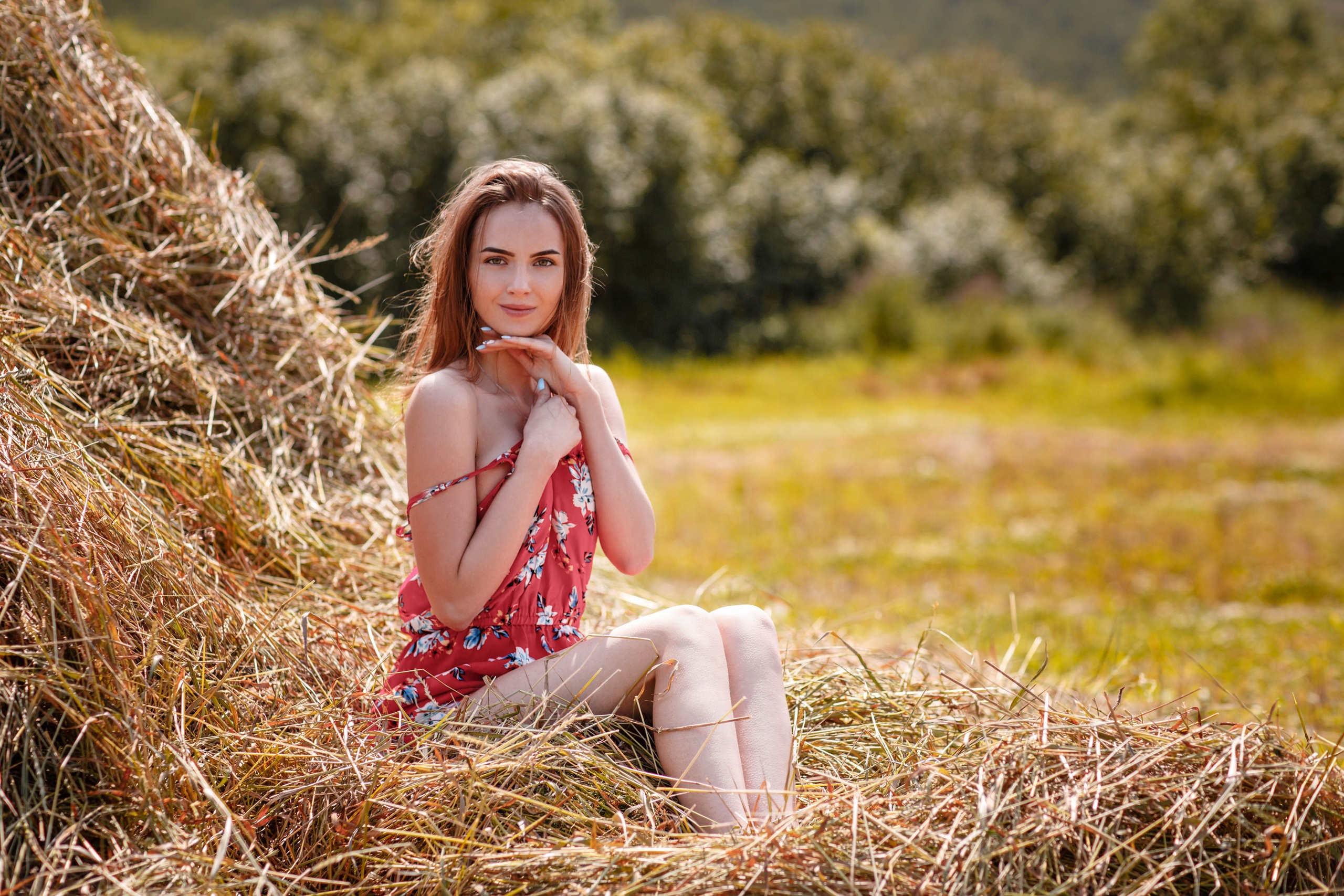 девушка, молодая женщина, молодые женщины, платья, ног, рука, шатенки, сидящие, сидя, сене, боке обои картинки скачать на рабочий стол ПК, планшета