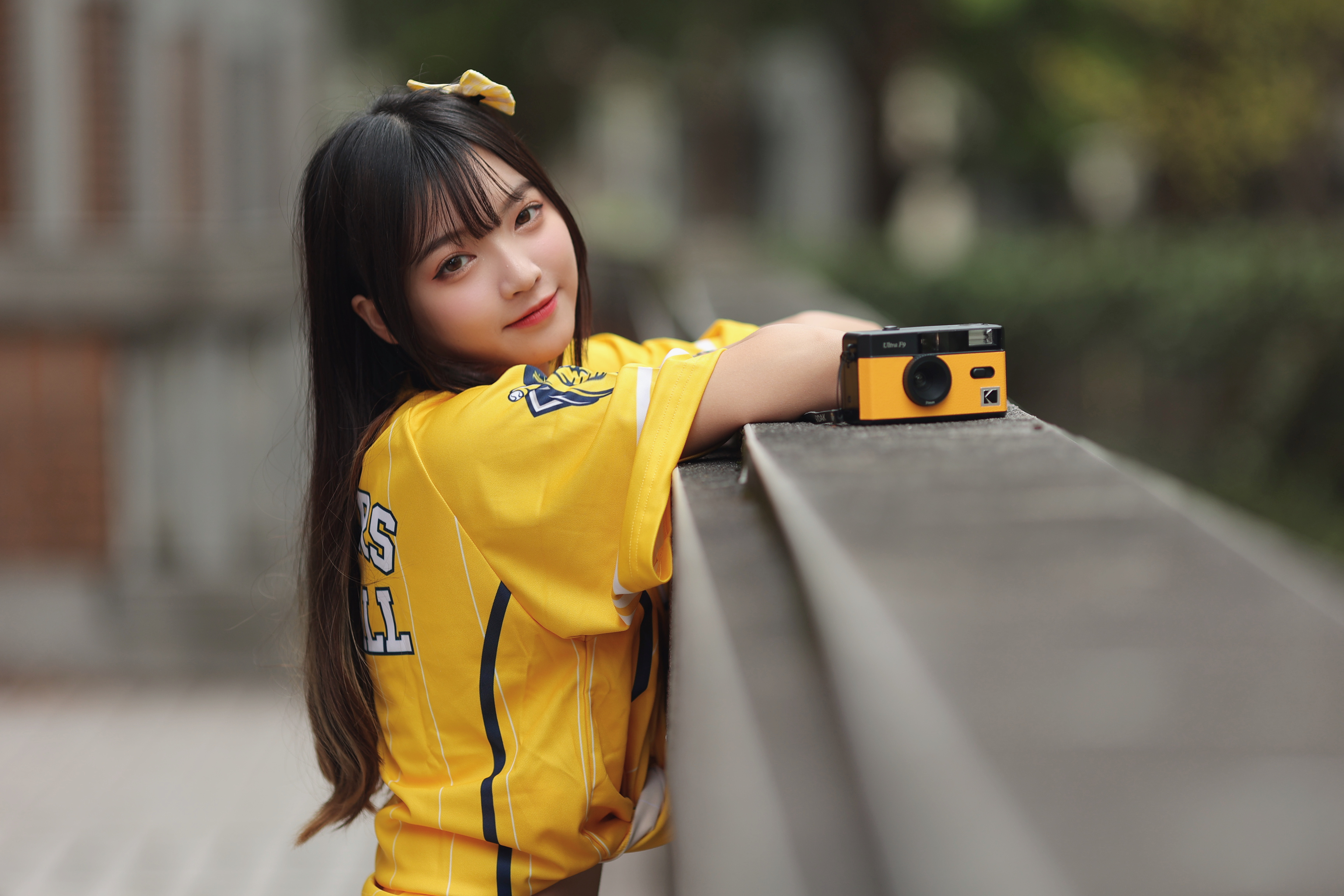 девушка, молодая женщина, молодые женщины, азиатки, азиатка, смотрит, смотрят, фотокамера, футболке, боке обои картинки скачать на рабочий стол ПК, планшета