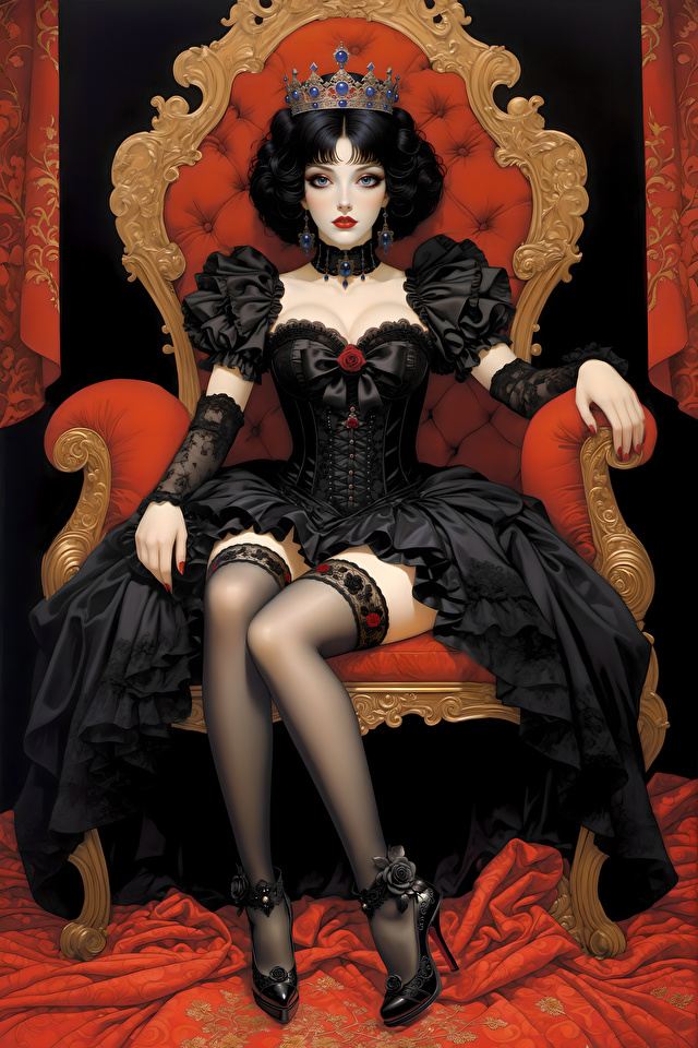 Корона Брюнетка Трон Сидит Ноги Чулки Туфли Платье Девушки Фэнтези фото 640x960