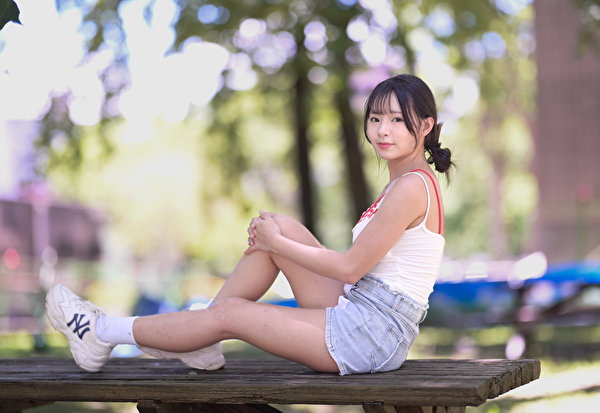 Азиаты Сидит Кроссовки Ноги Шорты Майка Размытый фон Девушки фото 600x413
