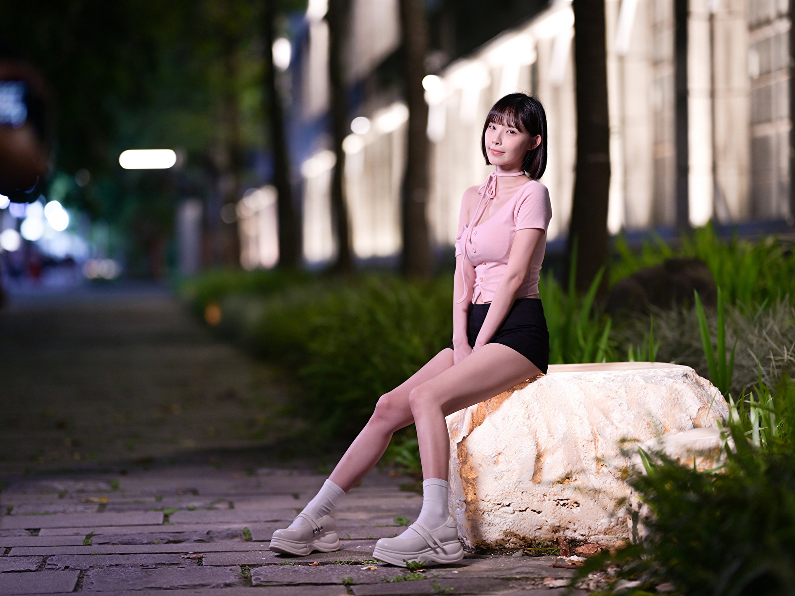 девушка, молодая женщина, молодые женщины, азиатки, азиатка, Камень, шорт, шортах, ног, сидящие, сидя обои картинки скачать на рабочий стол ПК, планшета