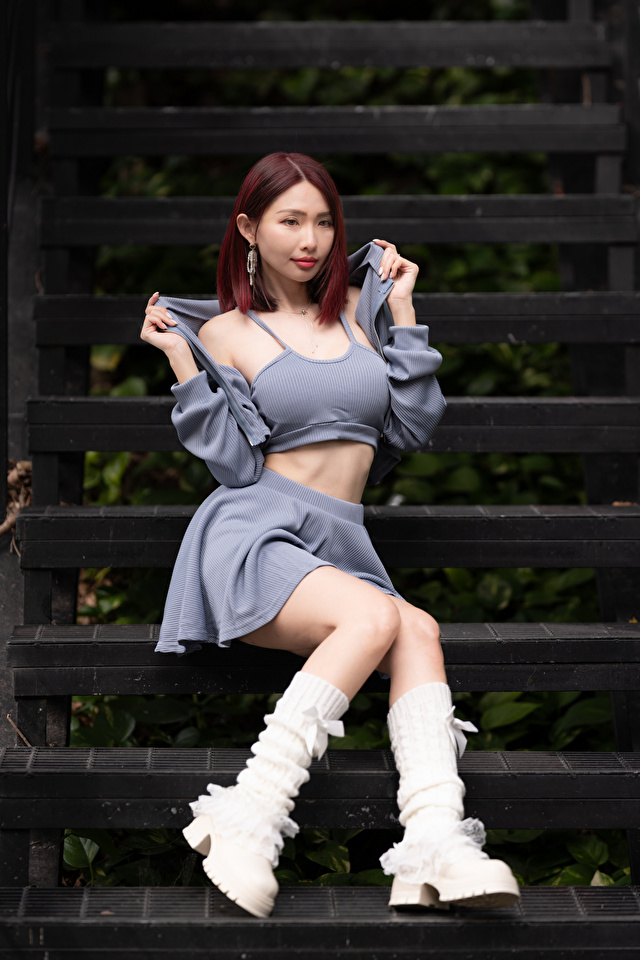 Азиаты Лестница Сидит Ноги Юбка Майка Девушки фото 640x960