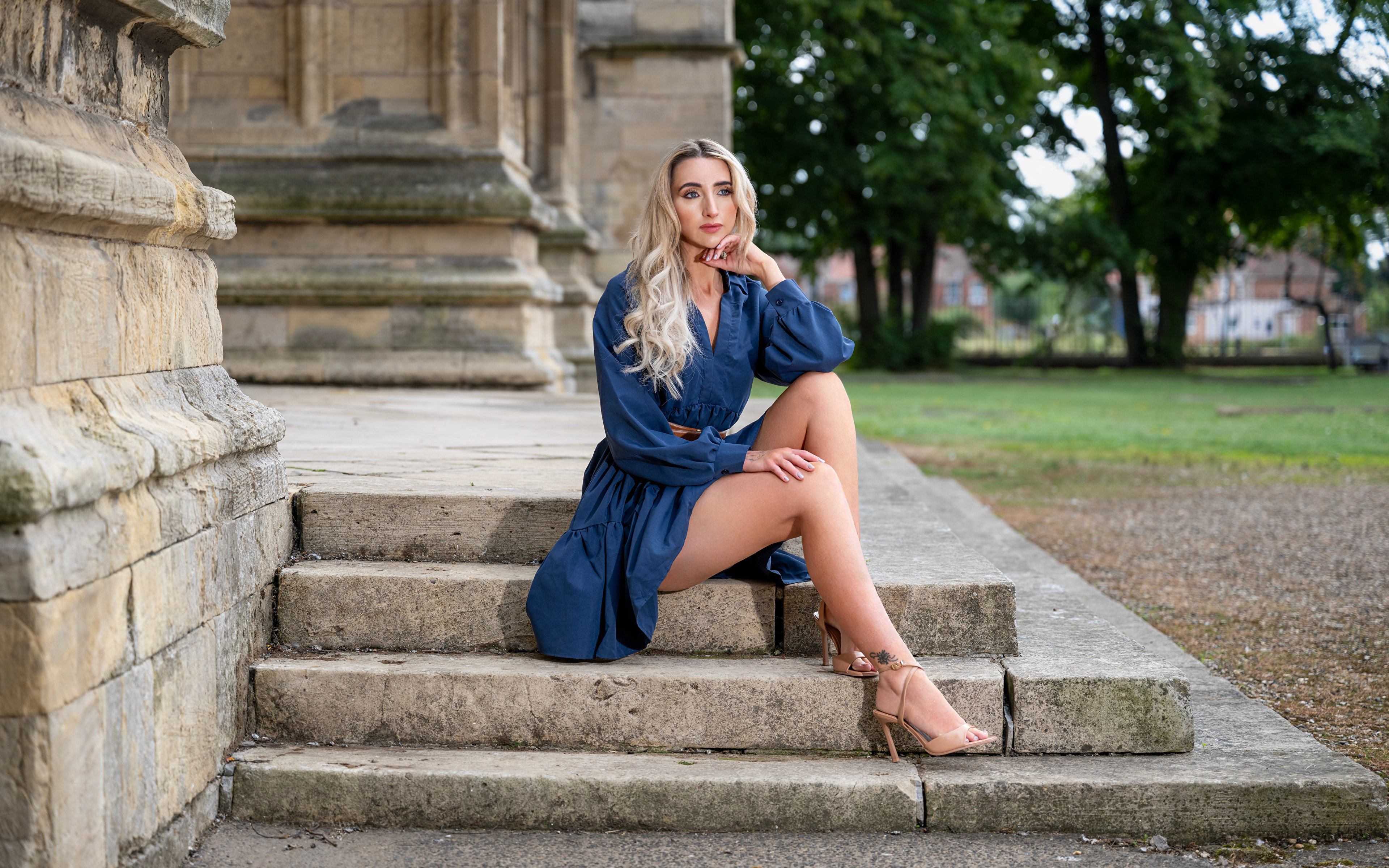 Tia Блондинка Лестница Сидит Ноги Платье Девушки фото 3840x2400
