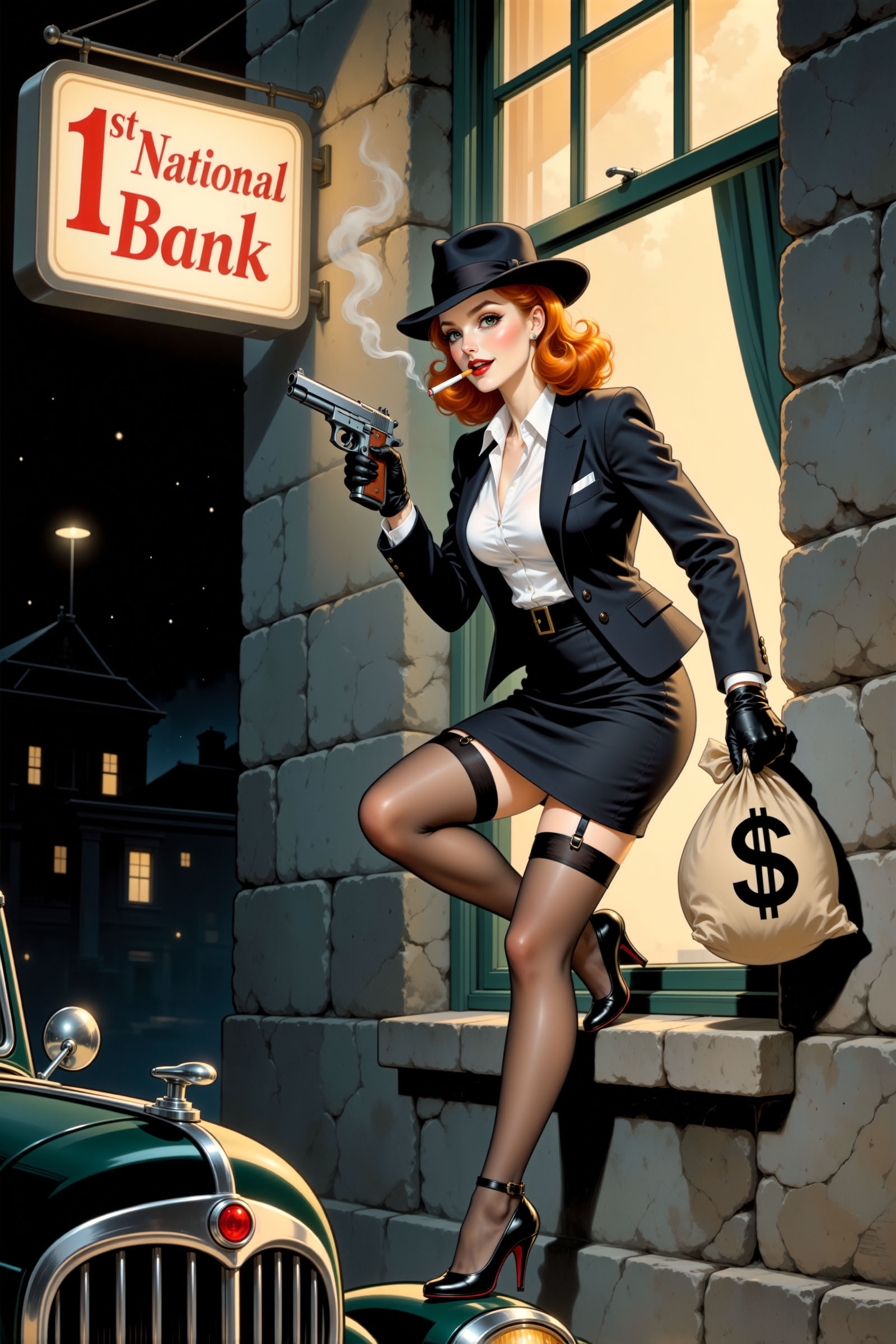 Банк Доллары Пистолеты Ai Шляпа Ноги Чулки Туфли Юбка Блузка Пиджак Рыжая Окно Девушки фото