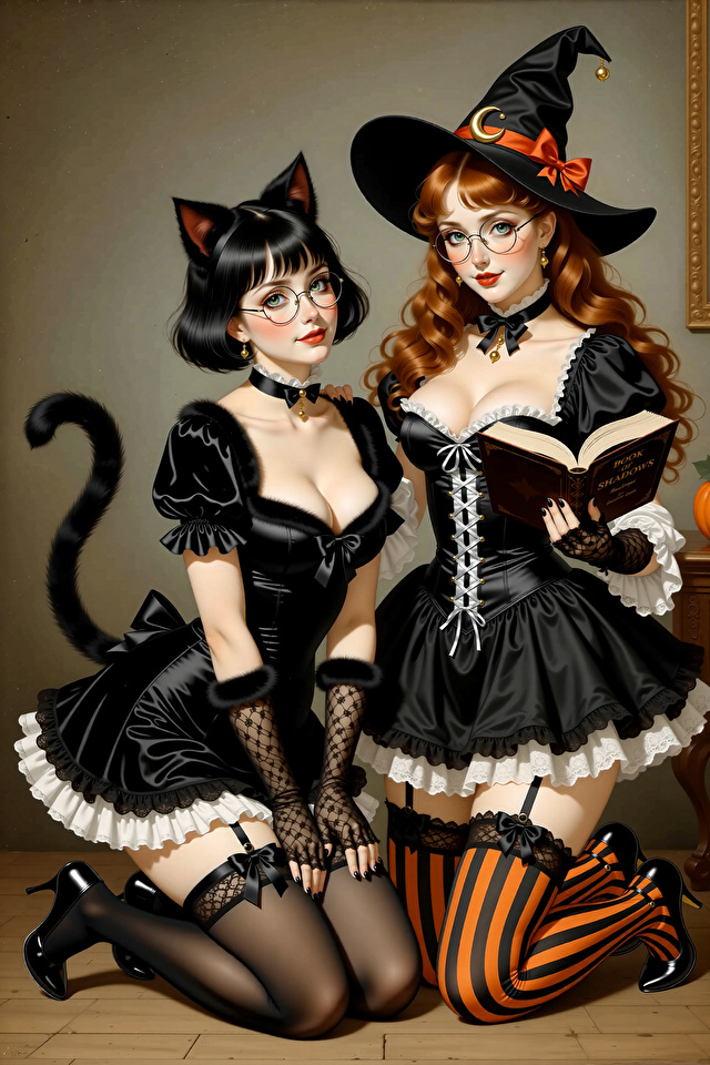 Ведьма Брюнетка Двое Шляпа Очки Платье Декольте Ноги Чулки Туфли Книга Рыжая Ai Девушки фото 640x960