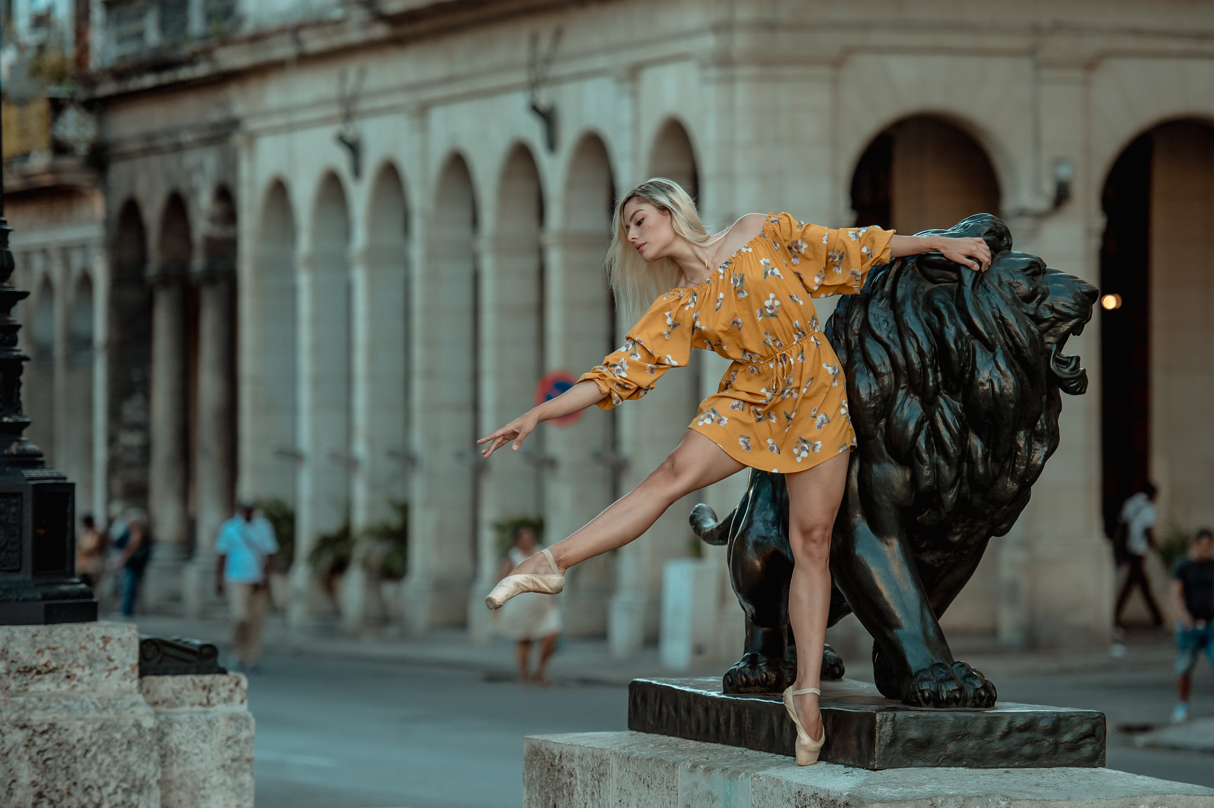 Львы Памятники Maylin Блондинка Платье Ноги Балет Танцы Девушки фото 4096x2726