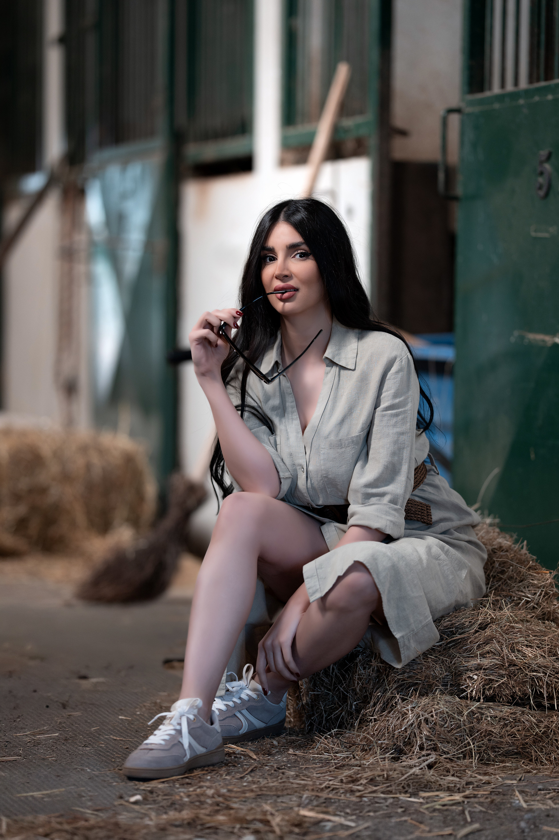 Nadia Брюнетка Сидит Ноги Платье Очки Девушки фото