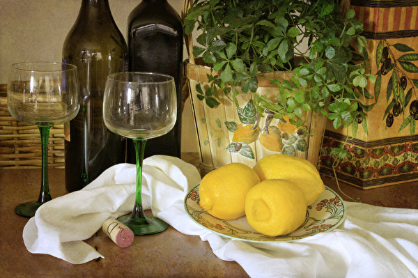 Лимоны Напитки Натюрморт Бокалы Бутылка Еда фото 600x399