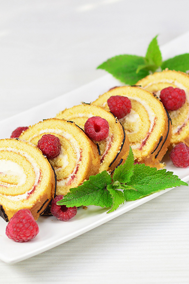 Рулет Малина Белый фон Листья Еда фото 640x960
