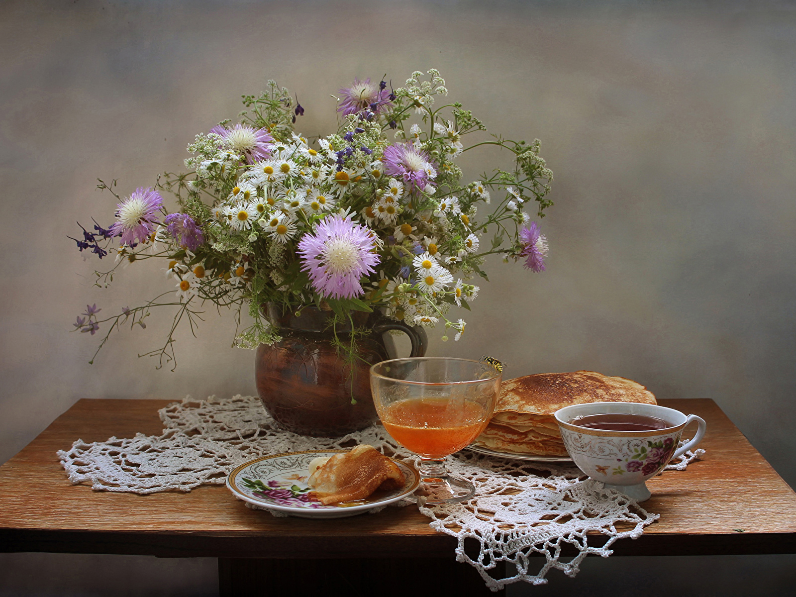 Натюрморт Букеты Ромашки Блины Чай Мед Ваза Чашка Бокалы Еда фото 1600x1200