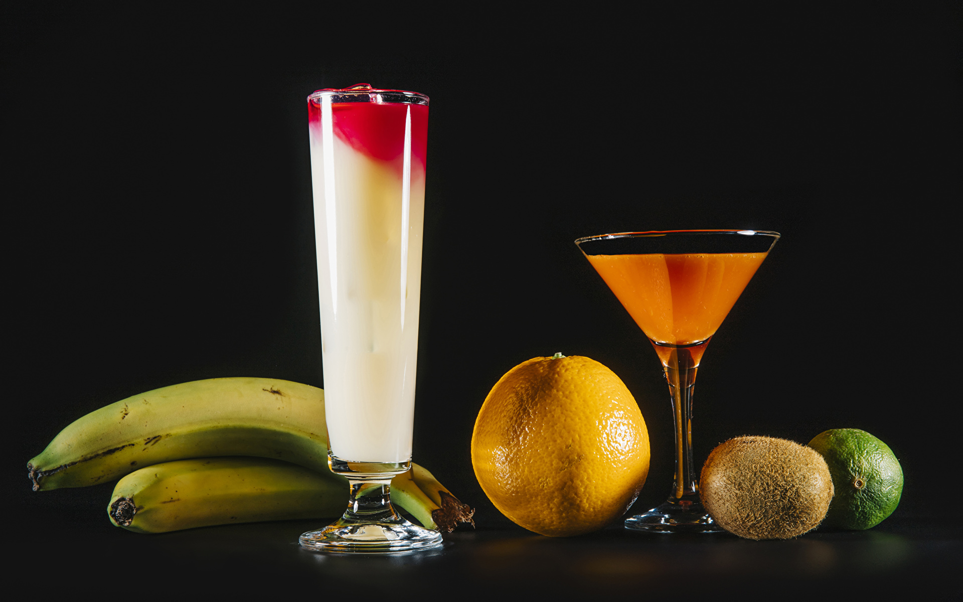 Сок Бананы Апельсин Киви Лайм Черный фон Бокалы Еда фото 1920x1200