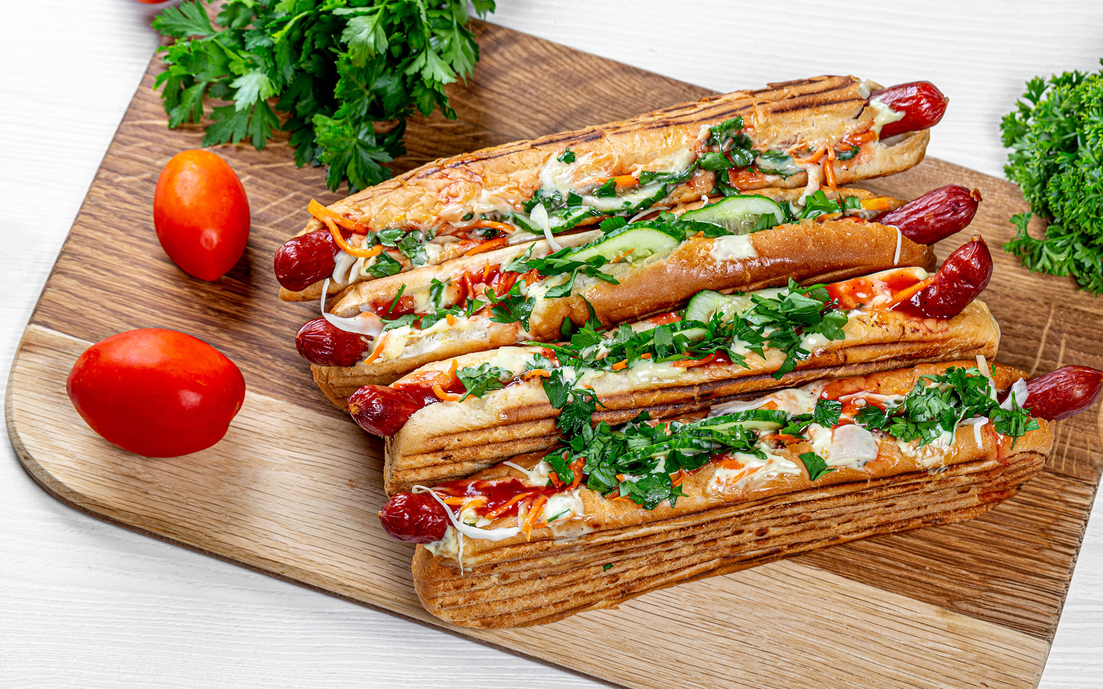Хот-дог Сосиска Помидоры Разделочная доска Еда фото 3840x2400