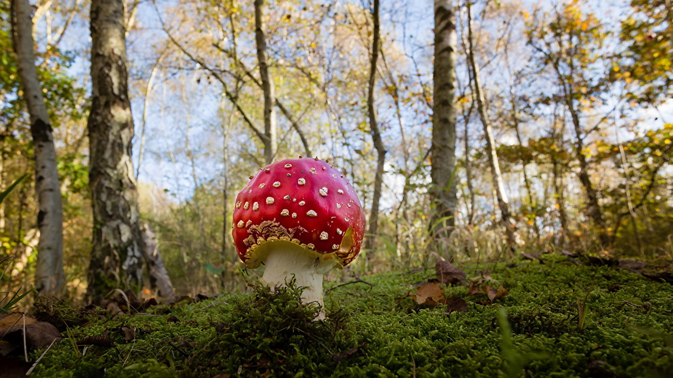 Леса Грибы природа Мухомор Березы Мох Природа фото 1366x768