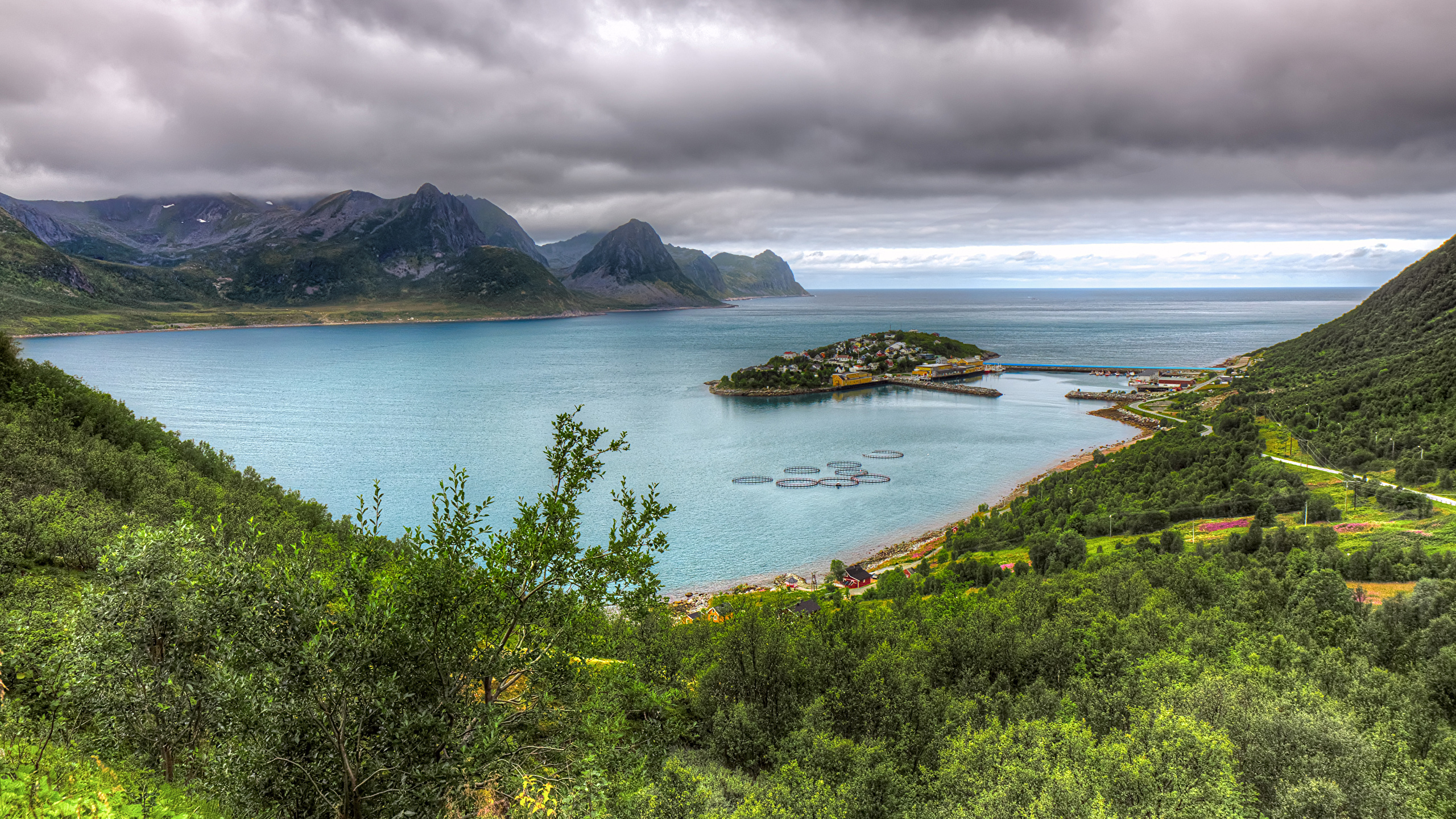 Норвегия Озеро Горы Остров Пейзаж Husoy HDR Природа фото 2560x1440