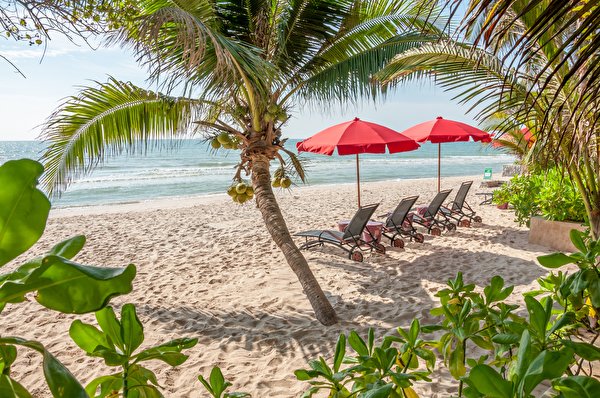 Пальмы Пляж Песок Лежаки Природа фото 600x398