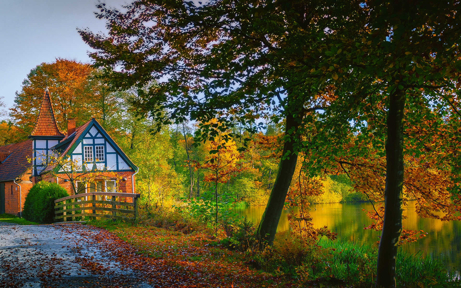 Германия Осень Дома Реки Ahausen Lower Saxony Деревья Природа фото 1920x1200