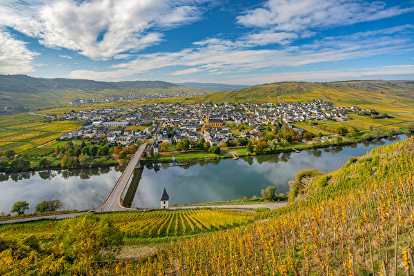 Германия Реки Мосты Виноградник Осень Пейзаж Trittenheim Природа фото 600x400