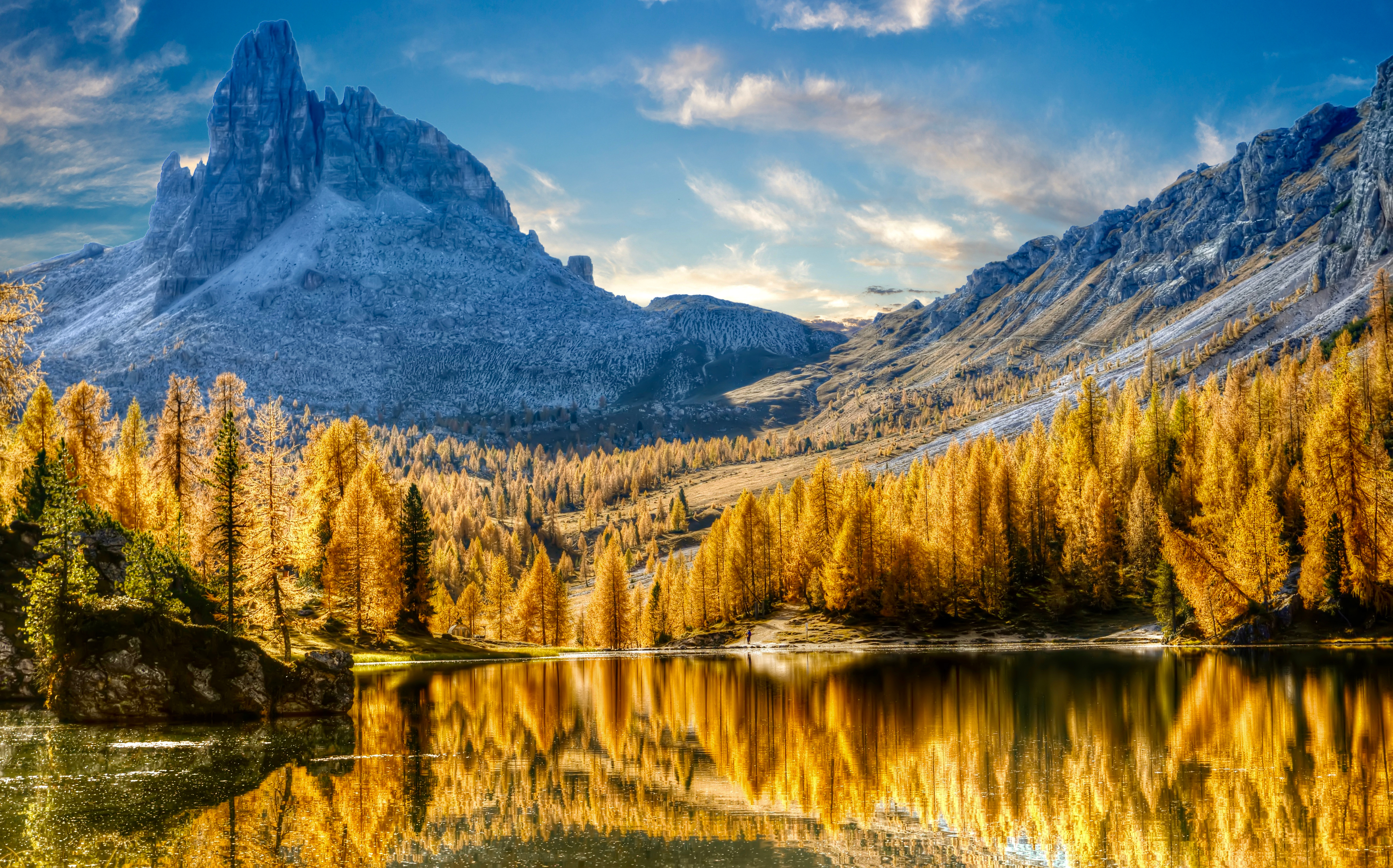 Италия Горы Осень Озеро Пейзаж Dolomites Альпы Природа фото 5785x3604