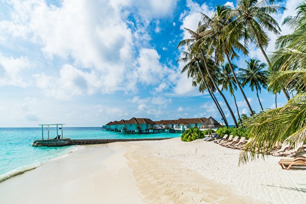 Океан Пляж Песок Пальмы Облака Бунгало Природа фото 600x400