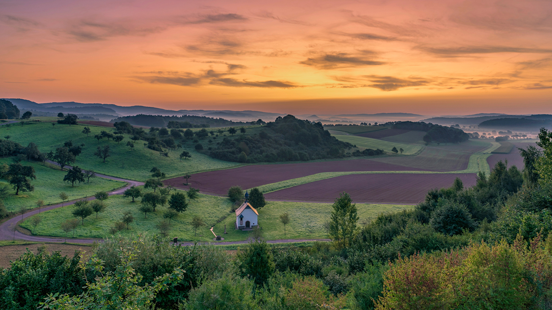 Германия Поля Дороги Eifel Холмы Часовня Природа фото 1920x1080