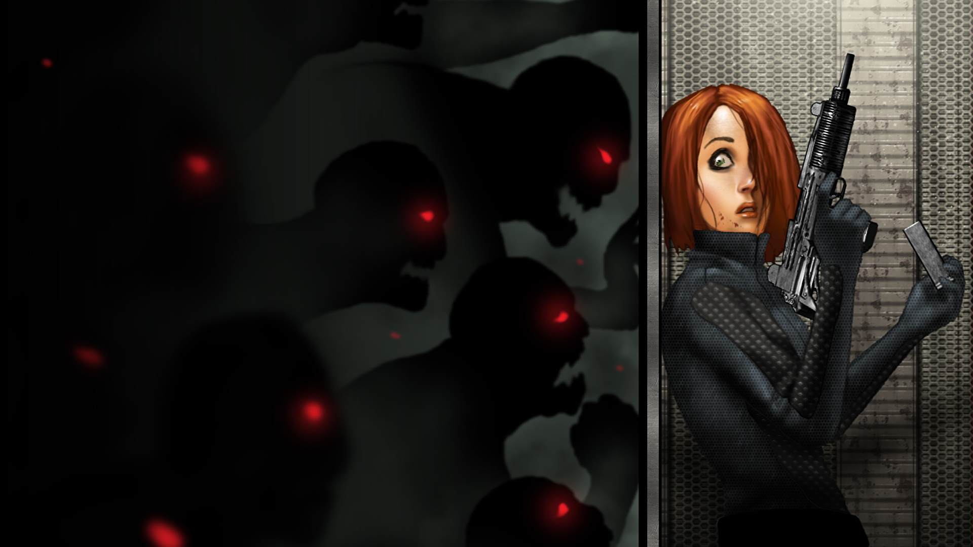 девушка, молодая женщина, молодые женщины, Фантастика, автомат, автоматом, рыжие, рыжих, испуг, боится обои картинки скачать на рабочий стол ПК, планшета
